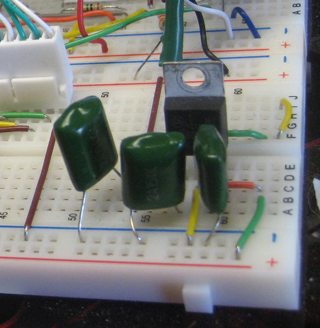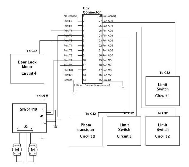 We used two 7.2V NiCad rechargeable battery packs as our robot’s power source (14.4 V). One of the battery packs was connected to the input of the voltage regulator to provide 5V stable voltage to C32, LM324, LM339 modules, limit switch circuit and door lock motor circuit. Two battery packs were connected in series to provide 14.4V to SN754410 controller module to run the motors for the wheels. Each battery’s anode was first connected to a 5V fuse for circuit protection, and then soldered to thinner wires, supplying power to each module. For most of the circuits’ building, we used the proto-board, which was convenient and fast for prototyping. Molex connectors were employed for connections between various modules and the proto-board. |