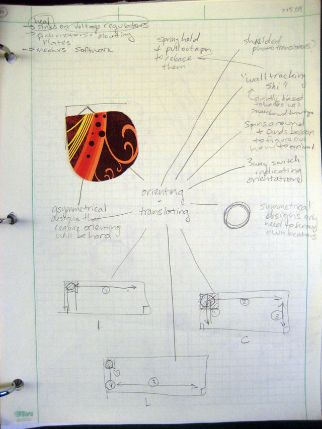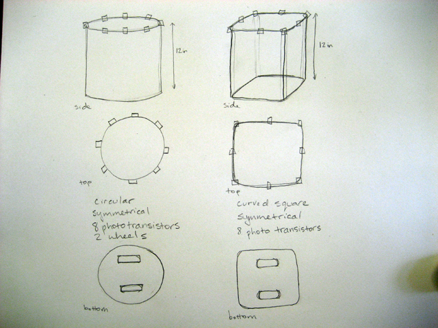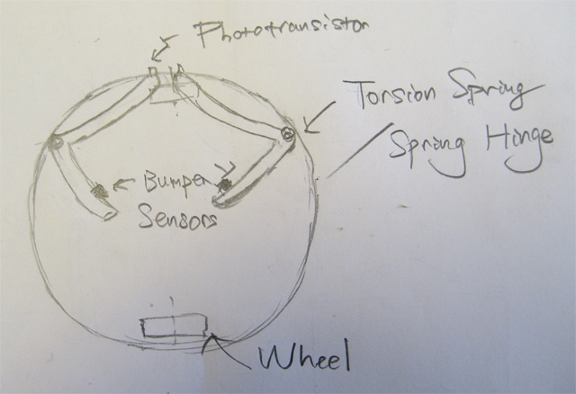 We looked over our brainstorming results and eliminated those ideas which were strictly illegal as per the rules of the competition, such as shooting water at the opponent or launching fireballs. We then eliminated ideas that were going to be too complicated to be completed within the timeframe of the project. One of these ideas was a shooting mechanism with a retractable ball so that one ball can be fire multiple times. Out of the remaining ideas we choose to present the ones that were the most easily implemented. Our team's strength lay in our mechanical knowledge. As such we decided to go with ideas that relied more on mechanical solutions and that involved minimal electronics and coding. We chose to focus on earning points by hitting the bumpers. We felt that this was going to be the fastest and most reliable method of scoring points. Our design had a circular or rounded square shape (at this point it was yet to be decided), arms that extend to hit the bumpers, and would follow the walls instead of the tape because we felt that tape sensing added unnecessary electrical and coding difficulty. Additionally our original design included a shooting mechanism and an eight photo transistor array beacon detector. During this design state we kept a file of top secret ideas that we did not present. If we found that we had enough time we would use these top secret ideas, but if we didn’t have the time or resources we would continue with our original idea. These top secret ideas were the top of our “out of the box” thinking. We would have liked to have these ideas implemented, but we didn’t want to discuss them lest they be used against us. |