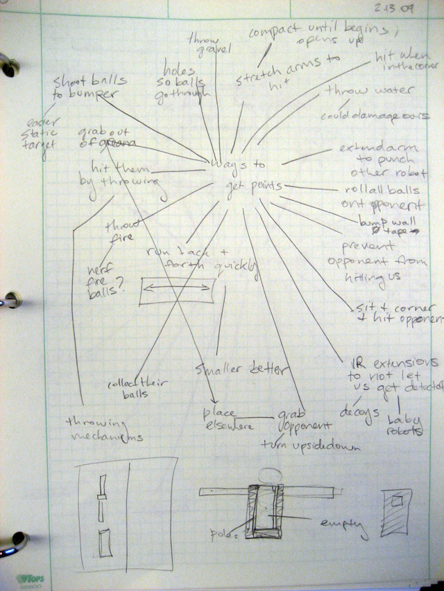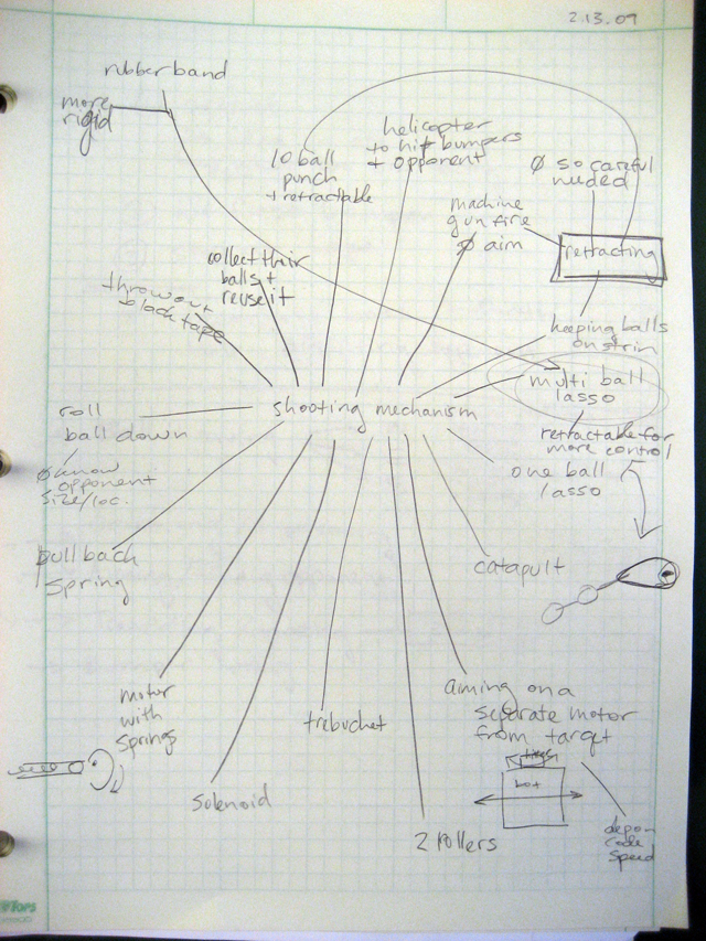 The team met in order to brainstorm and discuss ideas for our design. We laid this process out in an open forum in which we did not reject any ideas, no matter how out of the box or impossible they were. All of our ideas were outlined based on certain criteria that we were looking for. The criterion that we looked at first was how to score points. Each member wrote, told, or drew their idea down on a sheet of paper or on sticky notes. We got suggestions from simply moving back and forth, to more spectacularly launching Nerf balls of fire. At this stage no idea was rejected. During our initial meeting we also laid out brainstorming sessions for shooting mechanisms, driving mechanism, shape, orienting, and aiming. At the end of each brainstorming session we had several ideas for each aspect of the robot. For example: in terms of a shooting mechanism we had ideas of a catapult, a trebuchet, twin roller launched system, ratchet and spring system, turret cannon, machine gun, and all at once barrage. Because of the number of ideas that we had we chose to give code names to the ones we liked the best so that we can better identify it. The extending arms mechanism was code named “The Giver”, because of its appearance of someone opening their arms to give a gift, and the ratchet and spring launching system we code named “Hypersnail 2™”. Afterwards we had a collection of possible ideas to choose from. At this point we needed to narrow down the ideas to a set of five design concepts for the first design review of the project in which we would be presenting our design considerations to the class. |