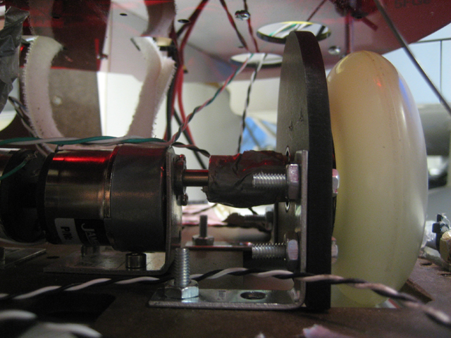 Our drivebase was made out of Masonite. We decided to use Masonite for its high strength and the ability to drill through it. We chose to go with the circular base design as opposed to the rounded square. We figured that if we needed to have a straight edge we could add some material more easily than if we chose a rounded square and needed a circular edge. The drivebase contained slots for the wheels and mounting points for the motors and the large screw shafts that would hold the upper platforms of our robot. We set the distance between two wheels relatively short to make the robot faster when spinning. The base of our robot was designed low enough so that under which no nerf ball can be stuck. That initially brought us a problem that there was too much friction caused by those screws under the base unnecessarily touching the ground. We first tried Teflon tape on those screws but that didn'tâ work very well. Later we grinded down those screws using a dremel, which gave our robot a better performance. |