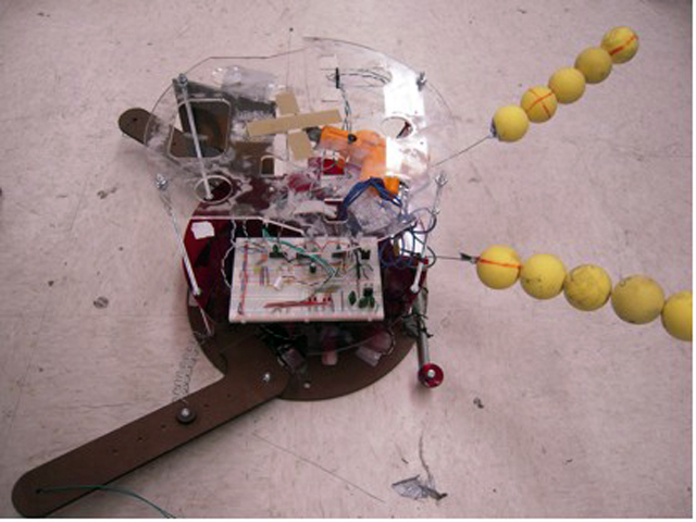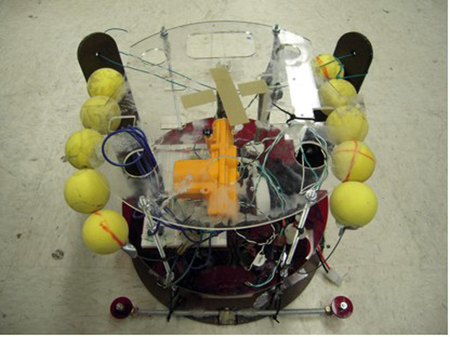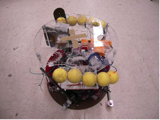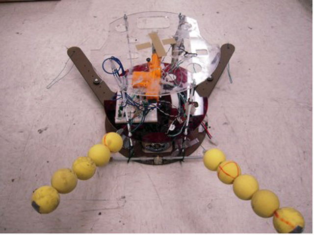 We realized that other robots employed the same strategy for getting points, but these robots were faster than ours. We would not win by hitting the bumpers alone. We did not have the time to construct a viable shooting mechanism, but we needed a method of scoring more points using the Nerf balls. At the last minute we added two music wire antennae with balls strung through them. The antennae would be tucked in underneath the arms, when the arms are released so are the antennae. These antennae would extend over the middle wall and contact the opposing robot when it passes by. This would potentially allow us to get extra points and defeat the opponent. |