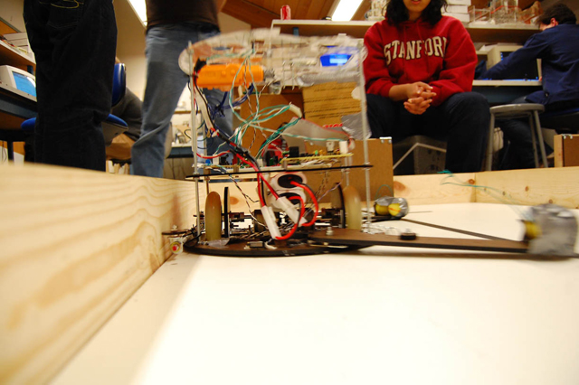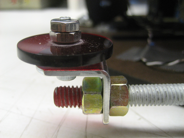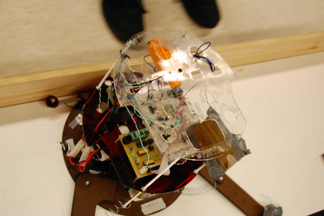 During testing of the robot it was found that the robot had difficulty maintaining a straight line. We decided that the round shape of the robot did not aid it in following the wall and that it had a tendency to deviate its angle as it followed the wall. We added a rod to the wall following side of the robot with hopes that the straightness of the rod would help the robot maintain a straight motion. However, adding the rod did not solve the problem. In fact it created a new problem: friction. The robot was still moving at an angle. This caused one side of the rod to rub against the wall excessively, generating a lot of friction, and reducing the overall speed of the robot. In order to counter the friction problem we added rollers to the ends of the rod. The rollers were made out of acrylic and were allowed to free spin, which significantly reduced the friction between the robot and side walls. |