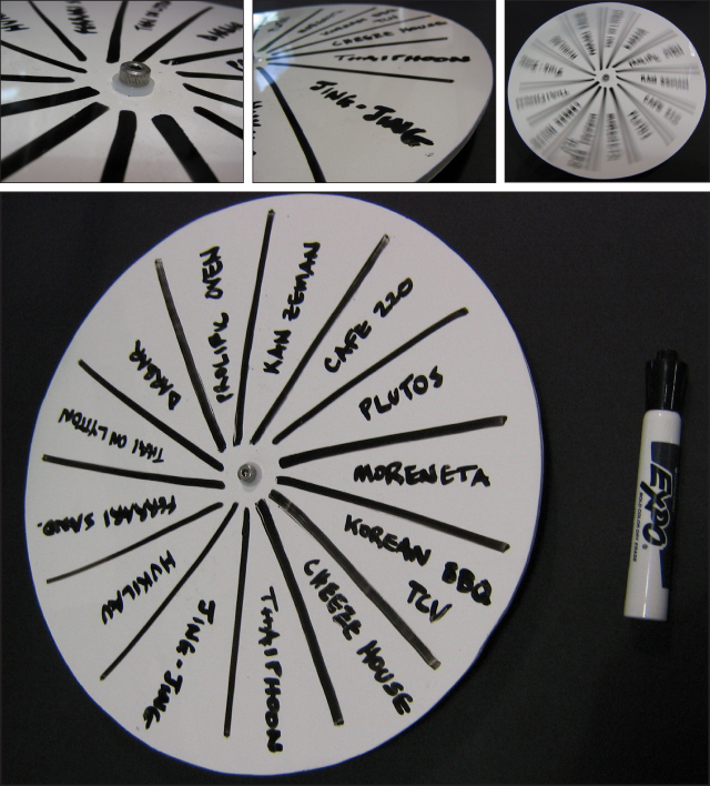 In response to a need for a better way to decide where to go eat lunch every day, I designed and created a rewriteable rotating wheel for my internship advisor at Function Engineering. I submitted design proposals, we conducted design reviews, and I worked with her to accommodate her preferences, budget, and time constraints. My lunch spinner is adaptable, easy to use, and comfortably fits in my advisor’s cubicle. Lunch disputes are certainly less frequent now. |